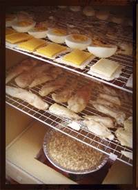 | ネットに入れ、風通しの良い日陰で乾燥させた食材たち。キミたちまだ色白だね。よしよし。 |